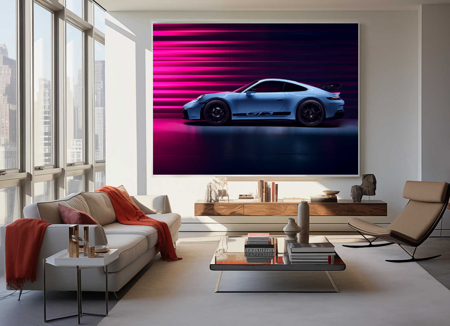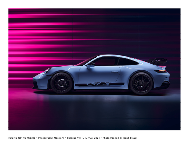 Bei einer Legende wie der achten Generation des Porsche 911 wollte ich nicht experimentieren und setzte in einen von der KI geschaffenen Raum eine reale Studiofotografie von dem sportlichsten Modell der 992 Familie ein, den GT3.